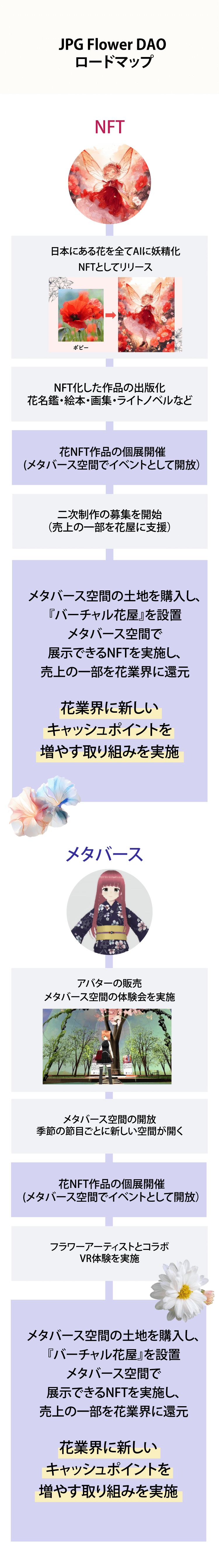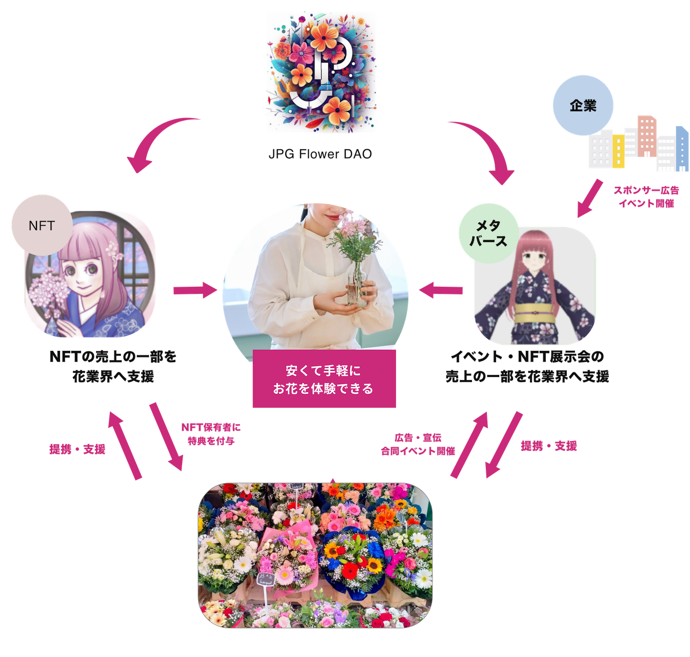 NFTやメタバース、AIの力を使って得た売上の一部を花屋や花生産者、フラワーアーティストに還元していくという仕組みを作ろうとするプロジェクトです。